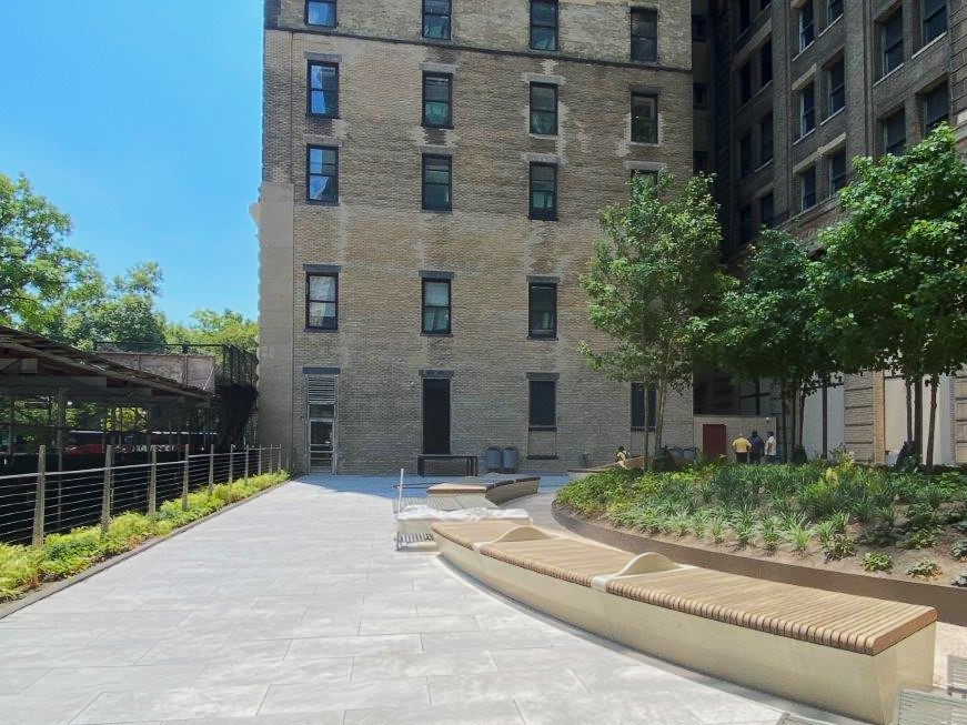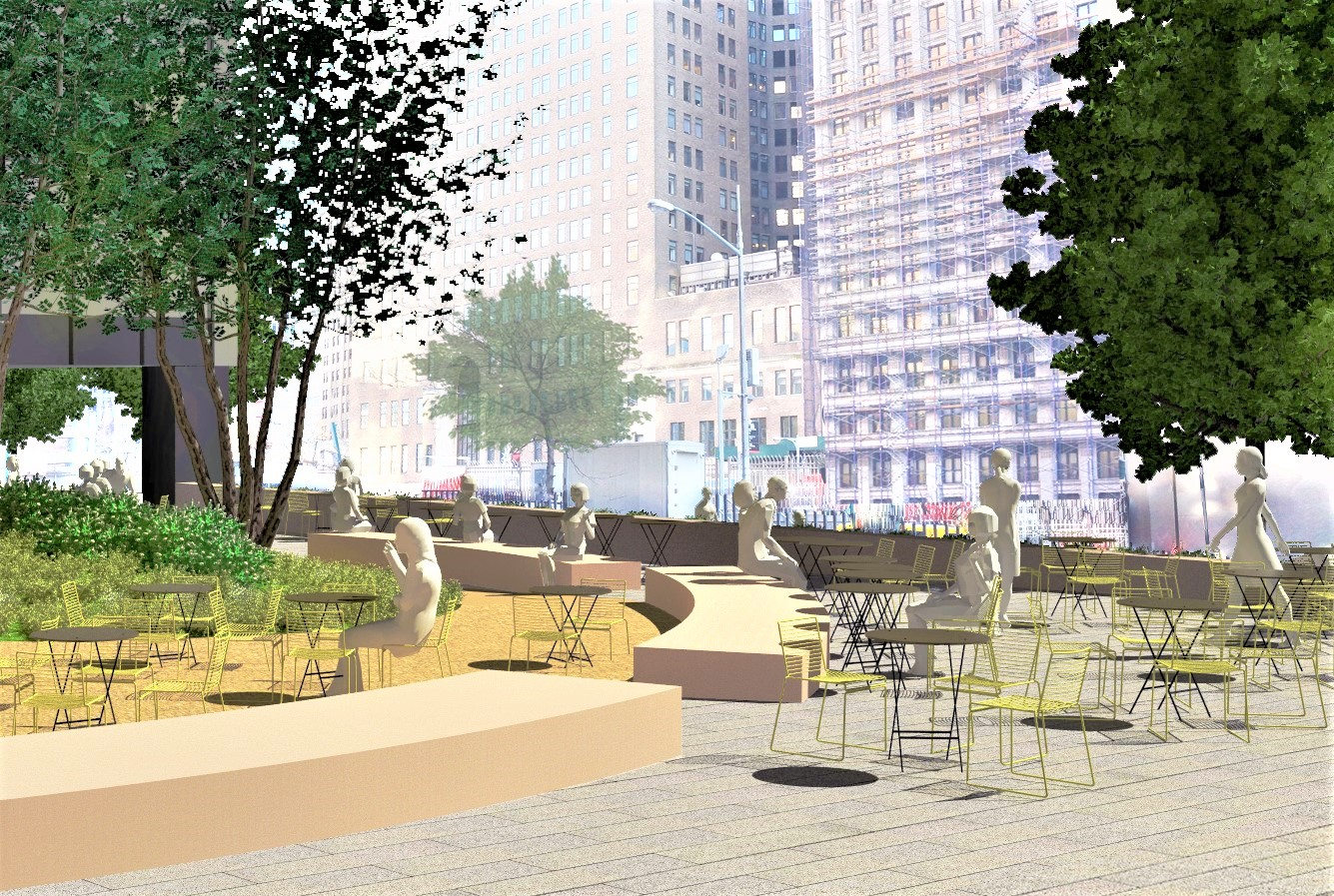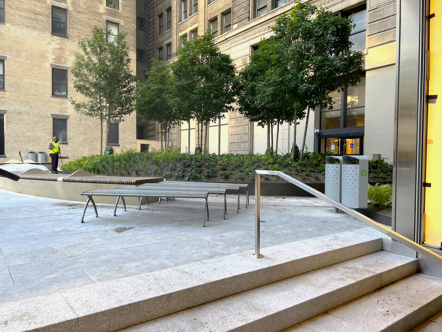 Distinctively positioned behind a landmark building with views of historic Battery Park, this publicly accessible plaza was damaged by Hurricane Sandy and required comprehensive reconstruction and redesign. As a private public plaza, its modest 6,500 SF size is accessible from its street and sidewalk frontage, a ground floor retail space, and Battery Place’s residential lobby entrance. The plaza rooftop structure, its mechanical infrastructure repairs, and its historic building conditions placed strict limitations on the redesign’s layout and breadth of surface improvements. Use flexibility was essential to its success in accommodating a diverse demographic and user group that includes Battery Place habitants, its visitors, and the local downtown working community,Complying with NYC’s DCP’s private/public open space (POPS) detailed design criteria, a distinctive and memorable landscape destination was envisioned. Existing rooftop loading capabilities were reconciled to accommodate the plaza’s bold signature landscape feature - a mounded Red Maple grove. Conceived as a woodland garden, it is seen from street level and the plaza’s 3-sided building enclosure. Its scale is revealed as an eye-catching slice of nature mysteriously inserted within lower Manhattan’s “stone and metal canyon.” The trees’ tall leafy canopies and verdant woodland underplantings command a powerful street level presence intended to spark inviting interest and curiosity. A generous field of richly textured pavement is punctuated with a complimentary family of movable tables and chairs oriented around the contoured woodland garden. A fixed curvilinear seat wall which echoes the garden’s elliptical form adds to the plaza’s variety of communal gathering offerings.