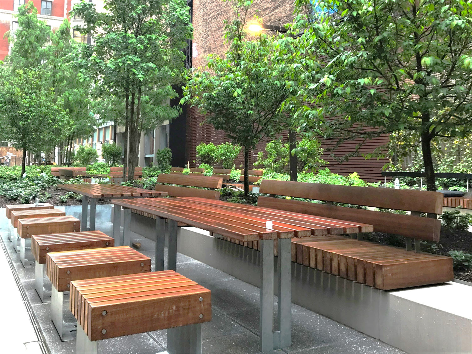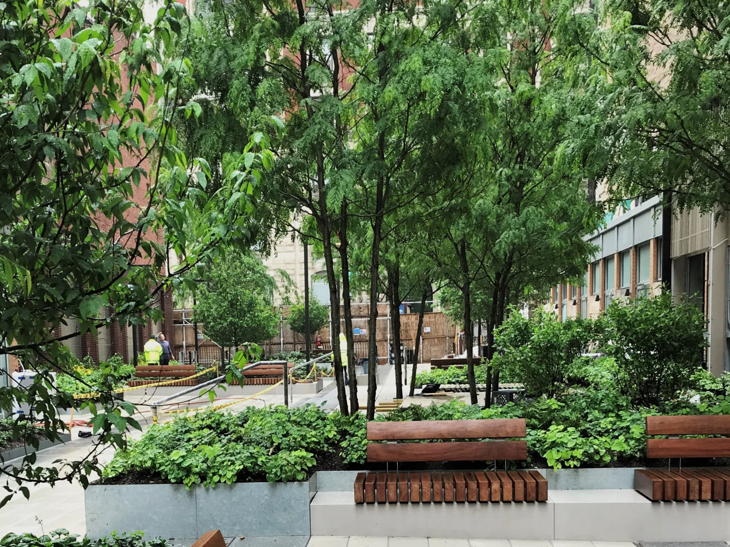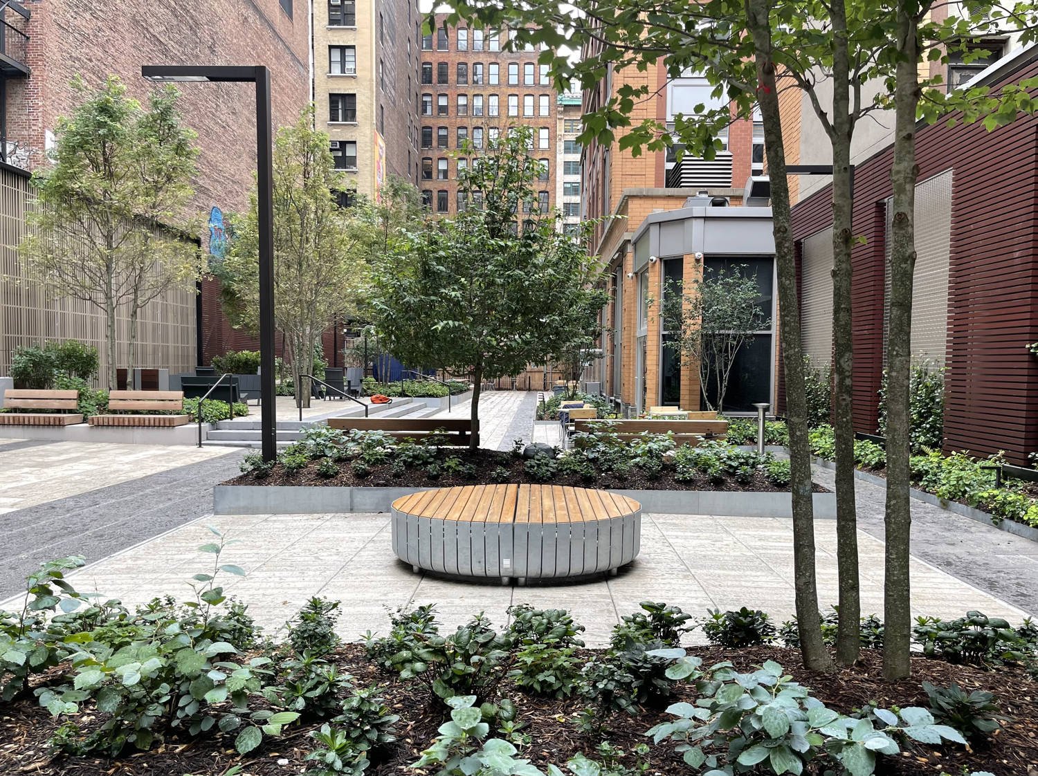 After nine years, the Chelsea Capitol residential building’s public plaza had deteriorated. As part of a comprehensive building renovation, the ground level lobby and main entrance design were reoriented to connect with its “rear yard” amenity space. Building infrastructure improvements required the plaza’s complete reconstruction. Improvements in public safety qualities were paramount. “Defensible space” strategies were employed to ensure uninterrupted visibility from the building’s interior and from within the plaza’s open space. The redesign presented an opportunity to reimagine the conventional paved urban plaza prototype. Alternatively, an approach which uses a contiguous landscape as the plaza’s primary spatially organizing mechanism was pursued. The site’s shady environment inspired the concept of inserting an indigenous woodland landscape. Working with regional plant communities as a spatial framework, the plaza’s primary function as a neighborhood public gathering space, activity and meeting places were created by craving-out and shaping them from within the plaza’s landscape context. A sequence of resting and communal “garden-pods” were positioned along the plaza’s main through-block meandering path. Multi-sensual experiences gained by moving through a woodland garden are intended to slow foot traffic and inspire calming pauses to observe the variety of the plantings’ seasonal attributes. The biomass of the plaza’s tree canopies softens the surrounding buildings’ presence while improving human comfort with their cooling and shading effects. Perimeter custom designed fences, accented with espaliered vine-covered mesh panels, provide architectural spatial unity, and mask the unsightly mix of abutting buildings. The blending of the ground plane and vertical companion plant communities generate a memorable plaza identity as a nature-filled destination and safe community haven for building tenants, visitors, and neighborhood residents.