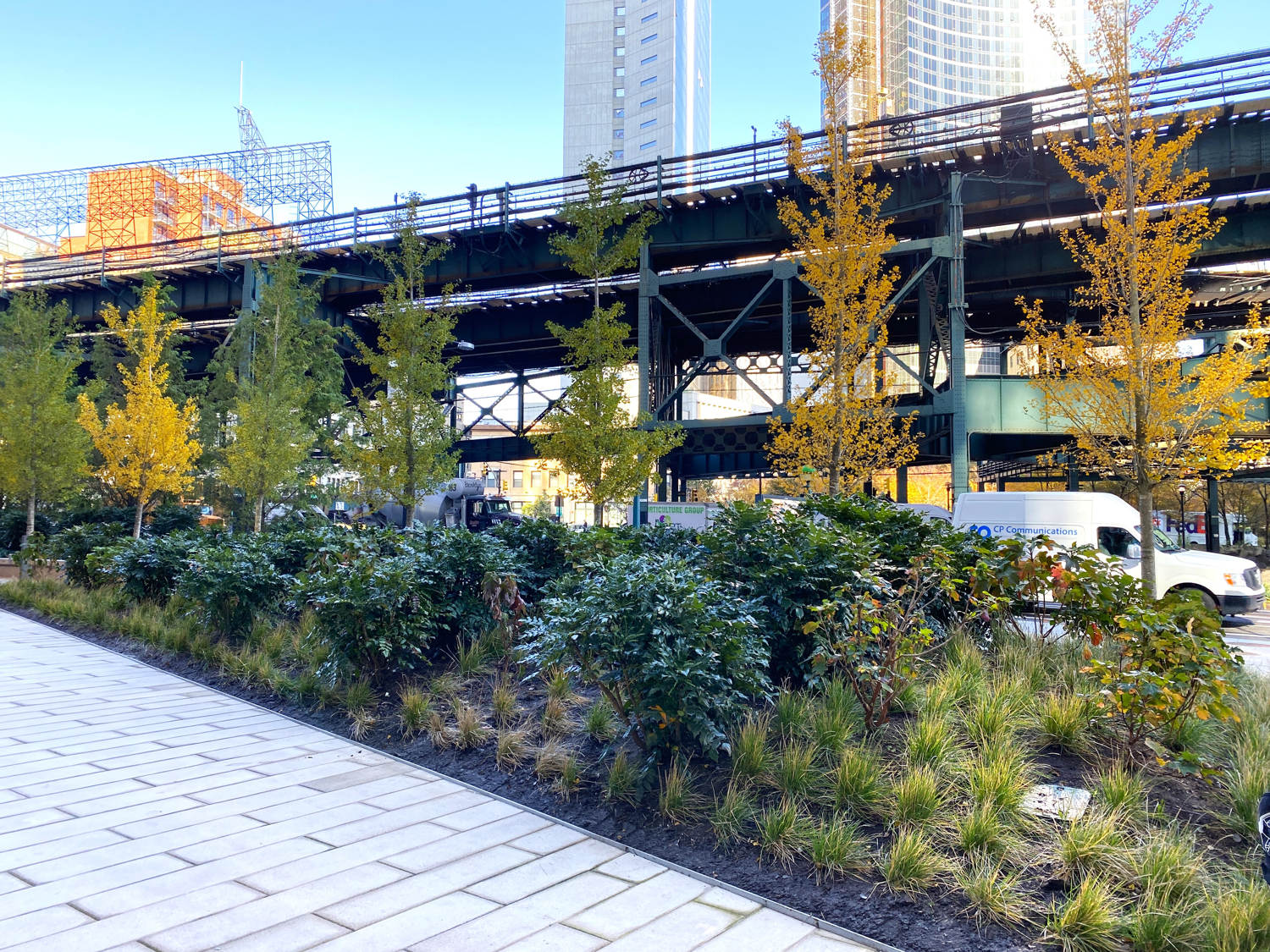 Formerly an open and undeveloped light industrial site, an opportunity for public space expansion and revitalization became and identity provoking part of a dual commercial tower development. The site’s wedge shape “left-over” space adjoins multi-laned streets and Queens elevated and noisy subway trestle. The plaza design prioritizes safe pedestrian movement by using existing barriers and its limited entry points to direct safe foot traffic. Large, mounded planting zones as vegetative boundaries create visual clarity for these “desire-line” routes to direct movement away from possible vehicular traffic crossings. Positioned along the streets and trestle edges, towering groves of Metasequoia trees with their seasonally robust under plantings attenuate buffer the neighboring noisy transit activity. A mitigating inward focus emerges to initiate social gathering and community engagement. A single row of ‘Autumn Gold’ Ginkgo trees distinctly register against Metasequoia forest as trail markers to further direct movement through the space. Places to congregate and meet within a spatial landscape context demonstrates the transformative value of using nature’s resources to create a neighborhood haven and memorable public space destination.