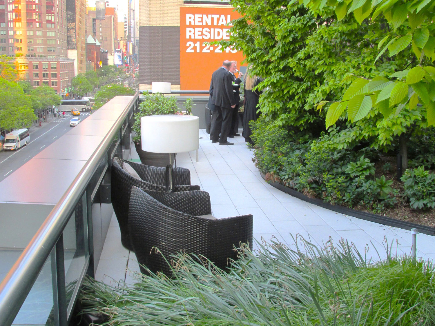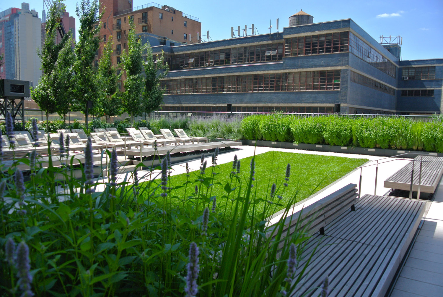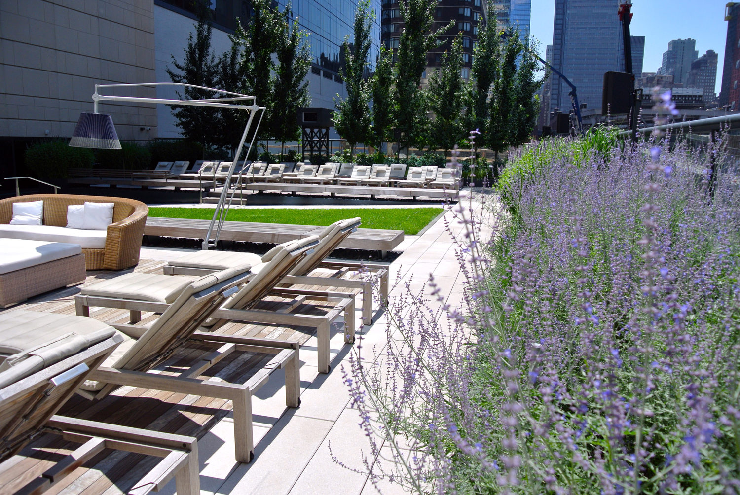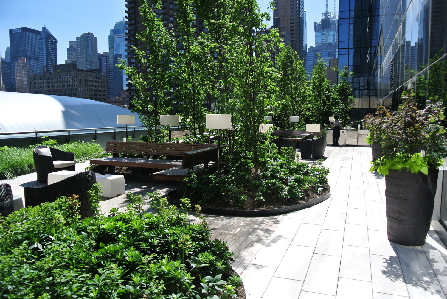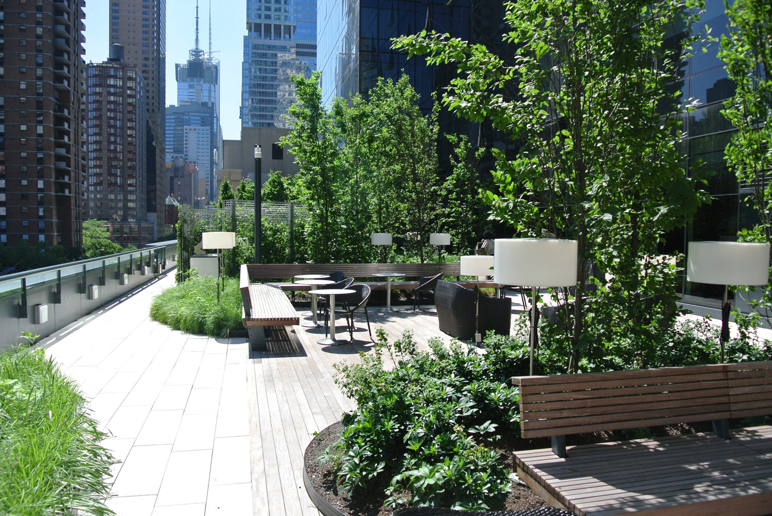 Anchored within a 60-story mix-use residential tower, a pair of award-winning roof terraces provide a calming escape from the bustling streets of its Times Square neighborhood. Completed in 2002, MiMA’s terrace landscapes set a new amenity standard for urban housing developments. Designed as complimentary outdoor living room extensions from the building’s interior common and amenity spaces. The north facing terrace rests on the 7th floor podium roof adjacent to the towering 60-story residential building. A forest of tall columnar Hornbeam trees meander within undulating the terrace’s center to spatially define a network of community gathering spaces. The Hornbeams’ height and dense massings introduce a humanizing scale to mitigate the tower’s overpowering presence. Alternatively, attention is cast downward and drawn toward the trees’ and under plantings’ foliage. Distinct and varying sized social “pods” were created by a complimentary mix of planting and garden architecture elements. The terraces are designed as a landscape within which residents can participate in a broad range of outdoor uses, activities, and natural world experiences.