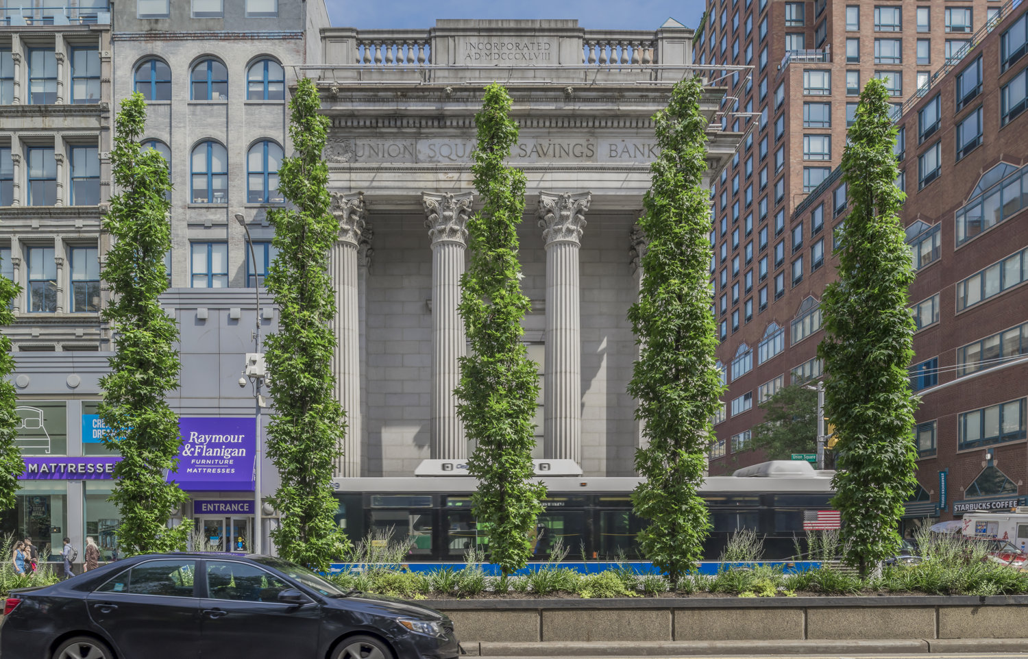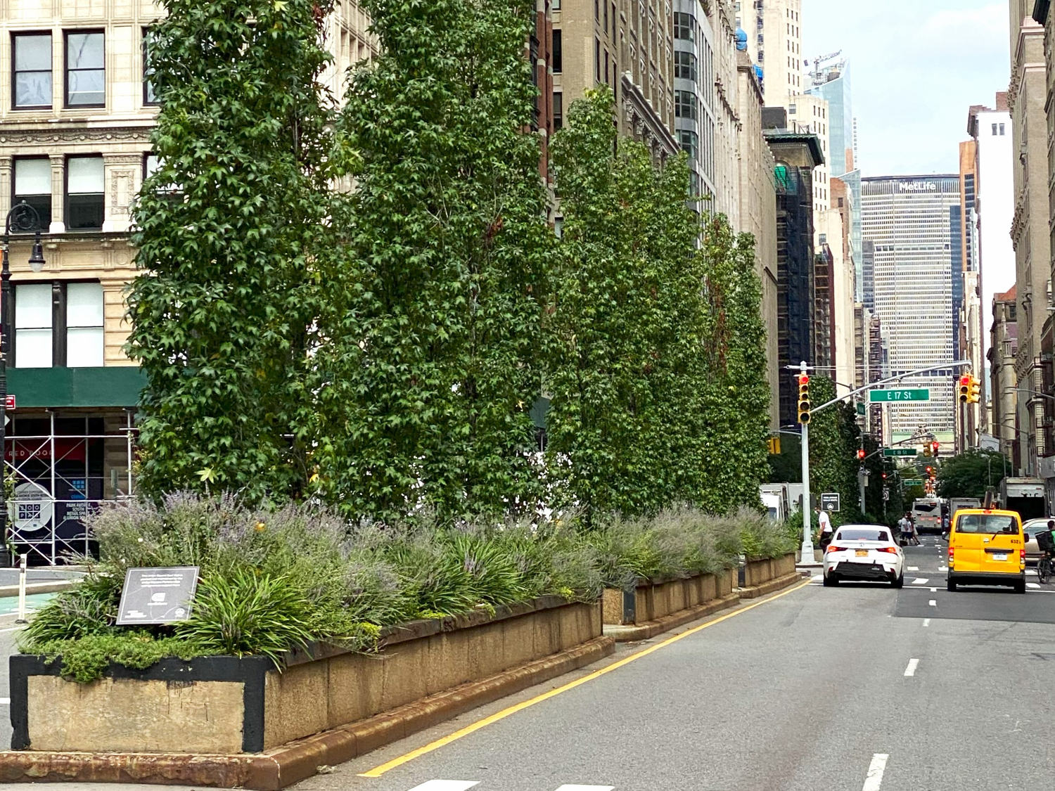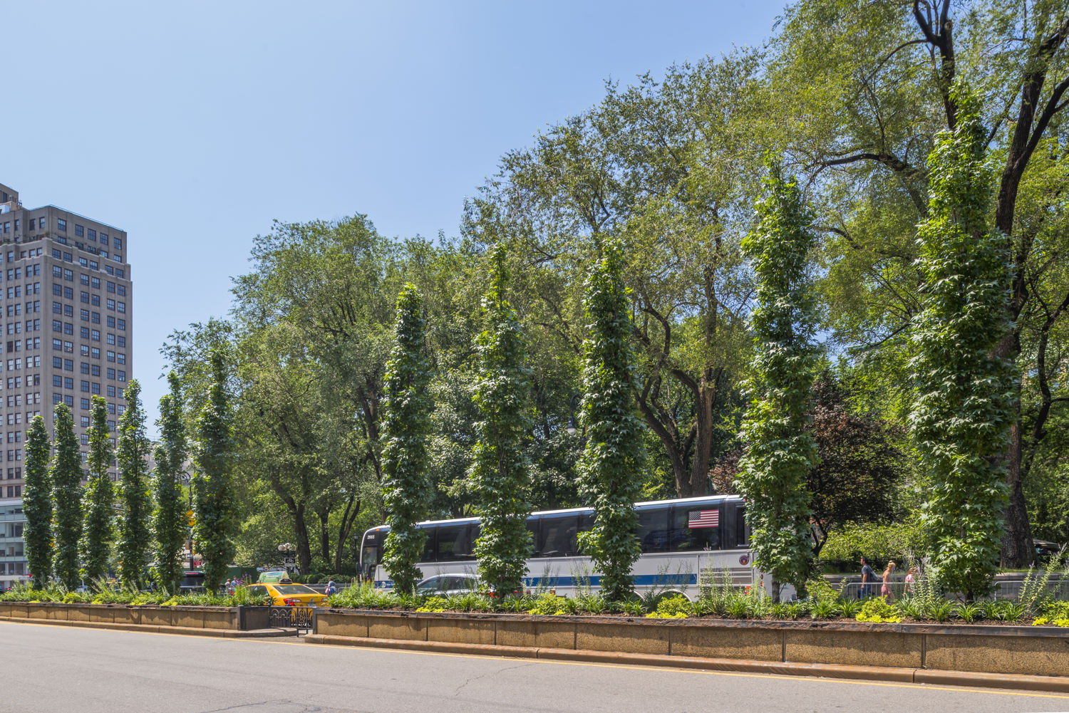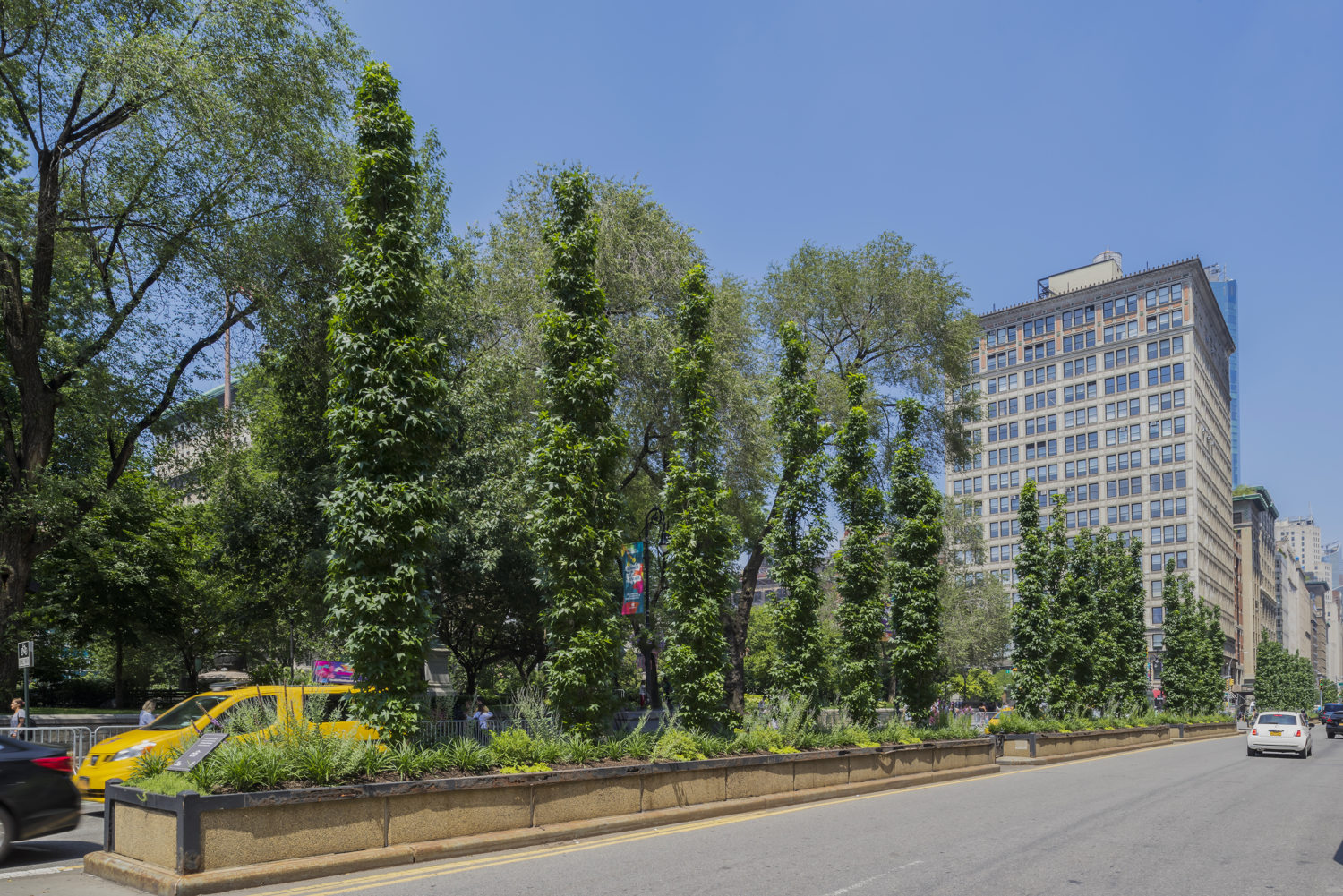With suitable soil improvements and growing conditions confirmed, inspirations to capture the visual and spatial qualities of revered European urban boulevards were pursued. Pollution tolerant columnar Sweet Gum trees met the horticultural science and the intended visual hedgerow design criteria. Stretching for more than 7 blocks, the trees’ tall and narrow columnar form emerged as a distinct “green” urban form slicing through the confines of the Avenue’s street wall corridor. Regular testing of soil structure and bio-mass root fungi activity informed seasonal organic soil feeding programs built-in to the project’s scope and budget. il structural and biomass specifications. Low growing evergreen groundcovers with accents of pollenating flowering and drought tolerant perennials complete the “Park’s” avenue restoration.