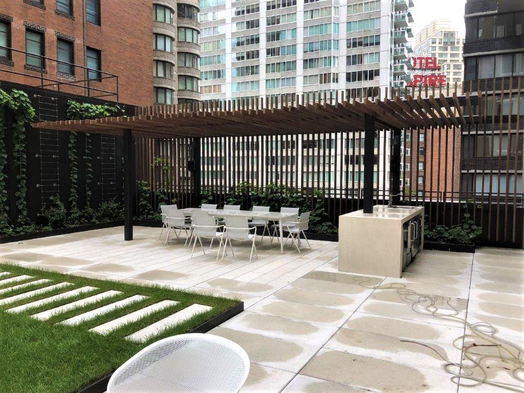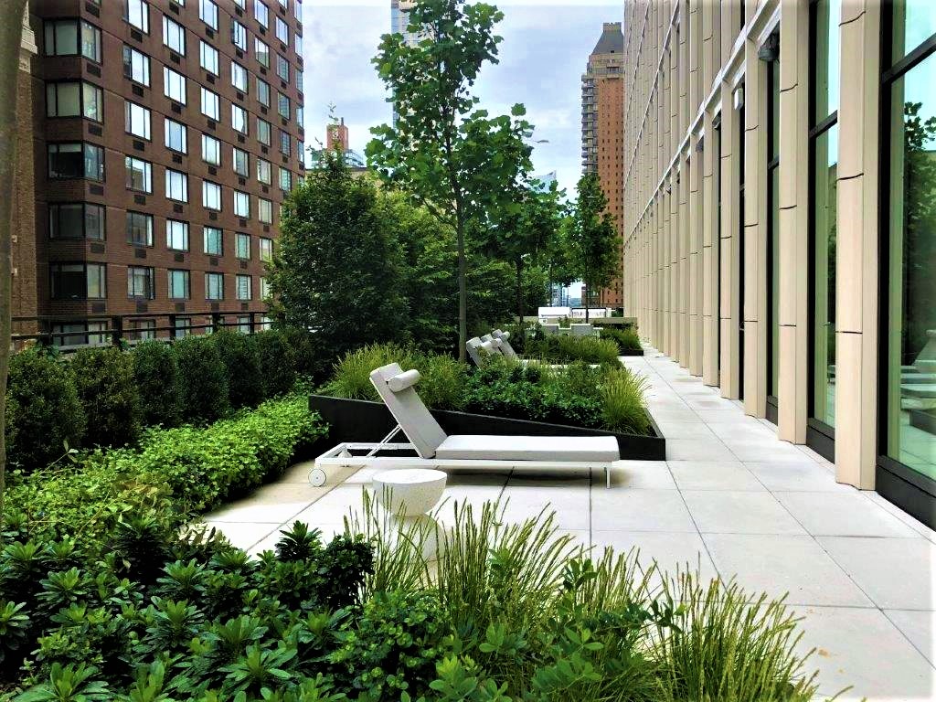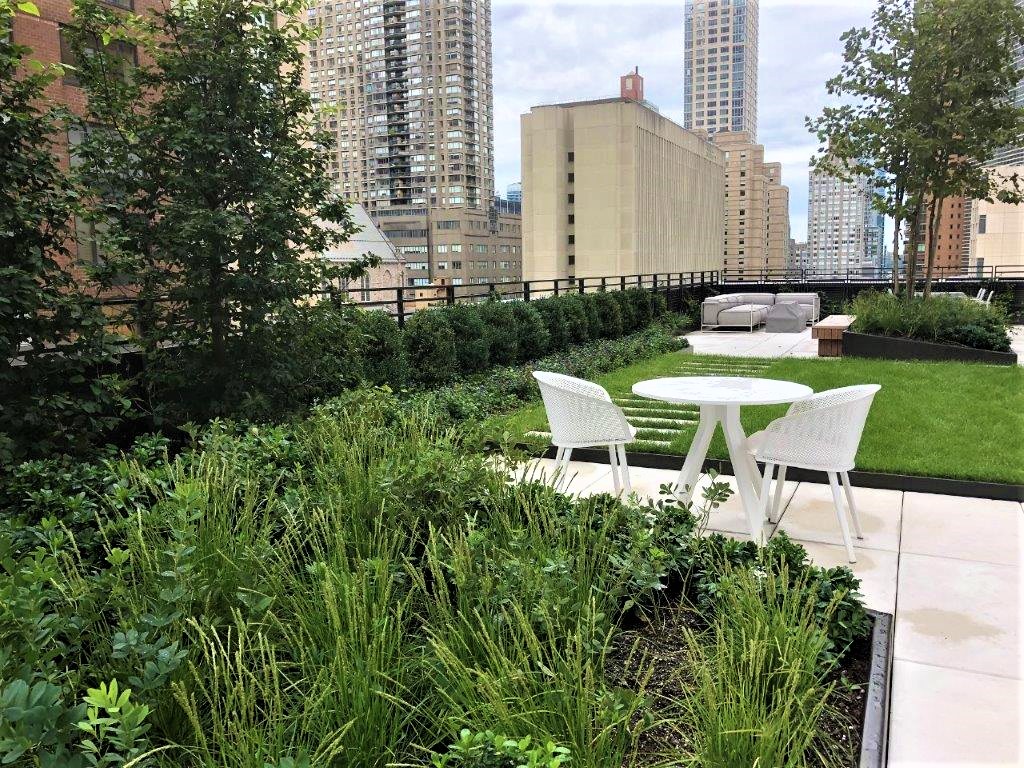 Strategically located a block from Central Park, the Park Loggia’s common roof terrace orientation and configuration frame a robust axial view corridor between the Hudson River and the Park. Despite the terrace’s programmed function as a multi-use shared open space amenity roof terrace, its shallow and long linear spatial proportion appeared more suited to a private residential garden. Each adjacent interior amenity room commands views directly onto the terrace and toward the buildings immediately across the street. The terrace’s 7th-floor elevation and three exposures called for improved privacy and a comprehensive vegetated overhaul to create a terrace landscape destination for the residents successfully. A tall, clipped Hornbeam hedge, planted at the roof’s parapet edge, established immediate privacy for interior spaces and a series of garden rooms envisioned to break up the terrace’s long and narrow configuration. The Hornbeam’s narrow and densely foliated form serves as a visual and spatial backdrop against which complimentary planting and landscape design elements are composed to accommodate various social gathering and activity spaces. The spatial efficiency of espaliered vine trellis panels, secured to the building’s parapet walls, continued the concept of a vegetated garden wall to complete the roof terrace’s garden framework.