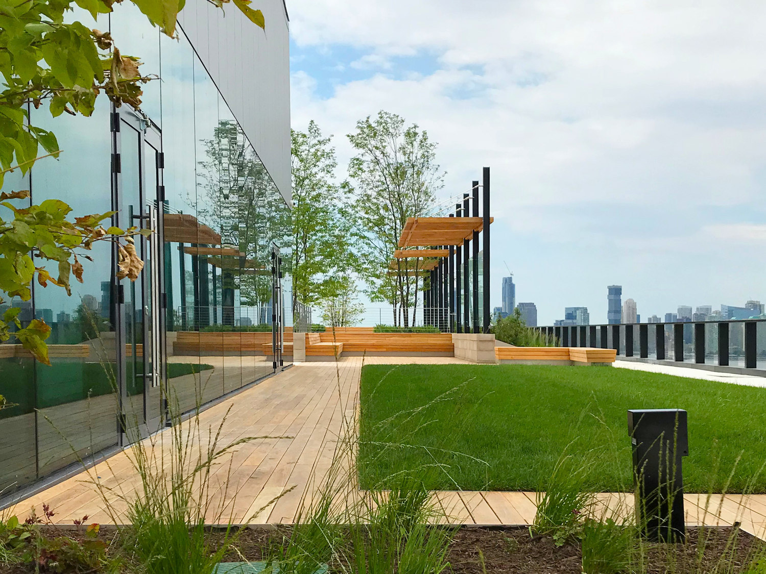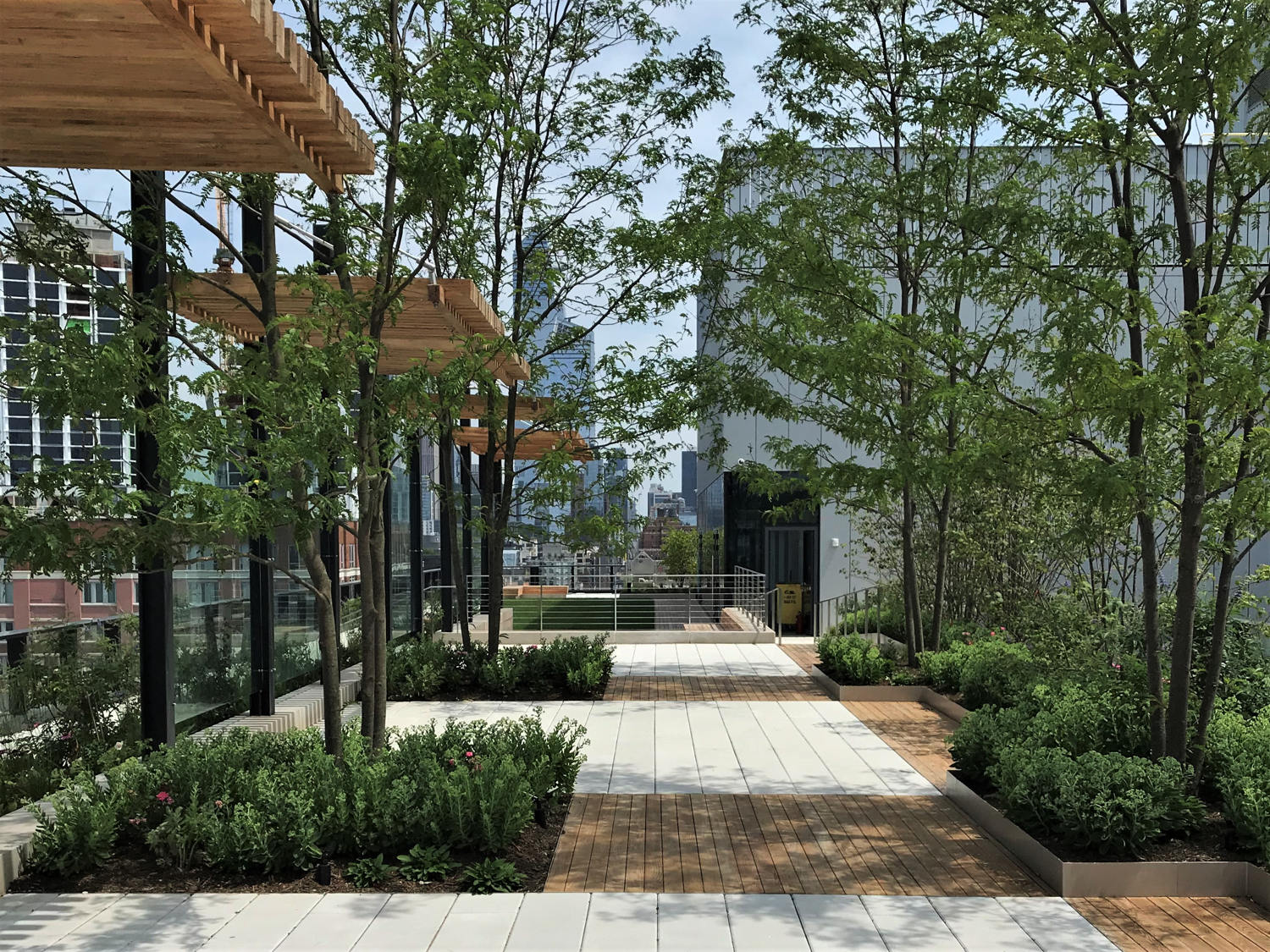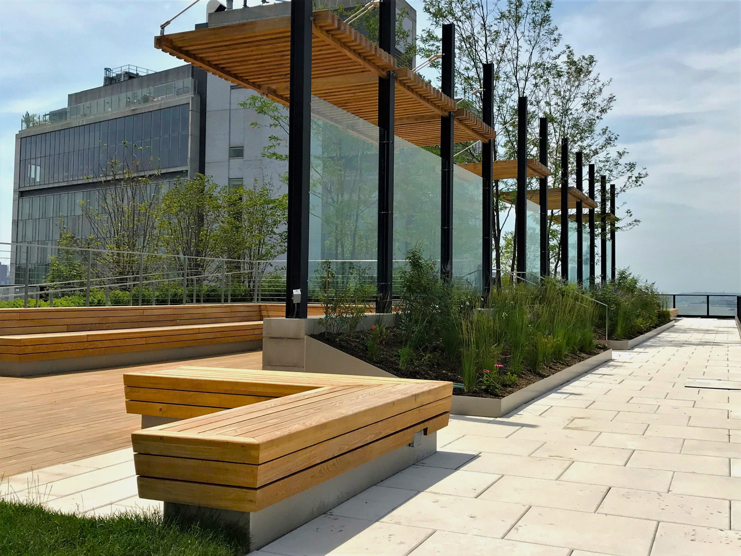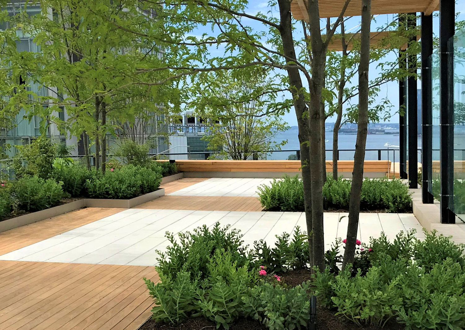 Embracing both city and garden, HMWhite’s Solar Carve sky garden exploits the unique shared landscape context of the Hudson River and the Highline below. Its 12-story roof exposure prompted a step-one investigation of its micro-climatic conditions to measure and assess human comfort levels. 3D wind and solar mapping model simulations revealed a series of seasonal extremes which would adversely affect use. Landscape buffers and garden structures were introduced to mitigate environmental and seasonal conditions, extend seasonal use, and enhance building tenants’ experiences day and night. A sequence of “outdoor” rooms was spatially organized for use flexibility within a visually cohesive landscape framework. A distinct garden material vocabulary was curated to reference the neighborhood’s historic charms while harmonizing with the building’s bold architectural and contemporary design. The Hudson River waterfront setting offers a one-of-a-kind outdoor workspace and entertaining experience. Options for a quiet place escape, places for group or team meetings, work lunches, and after-hours team building and entertaining occasions present a new paradigm for urban office space working environments.