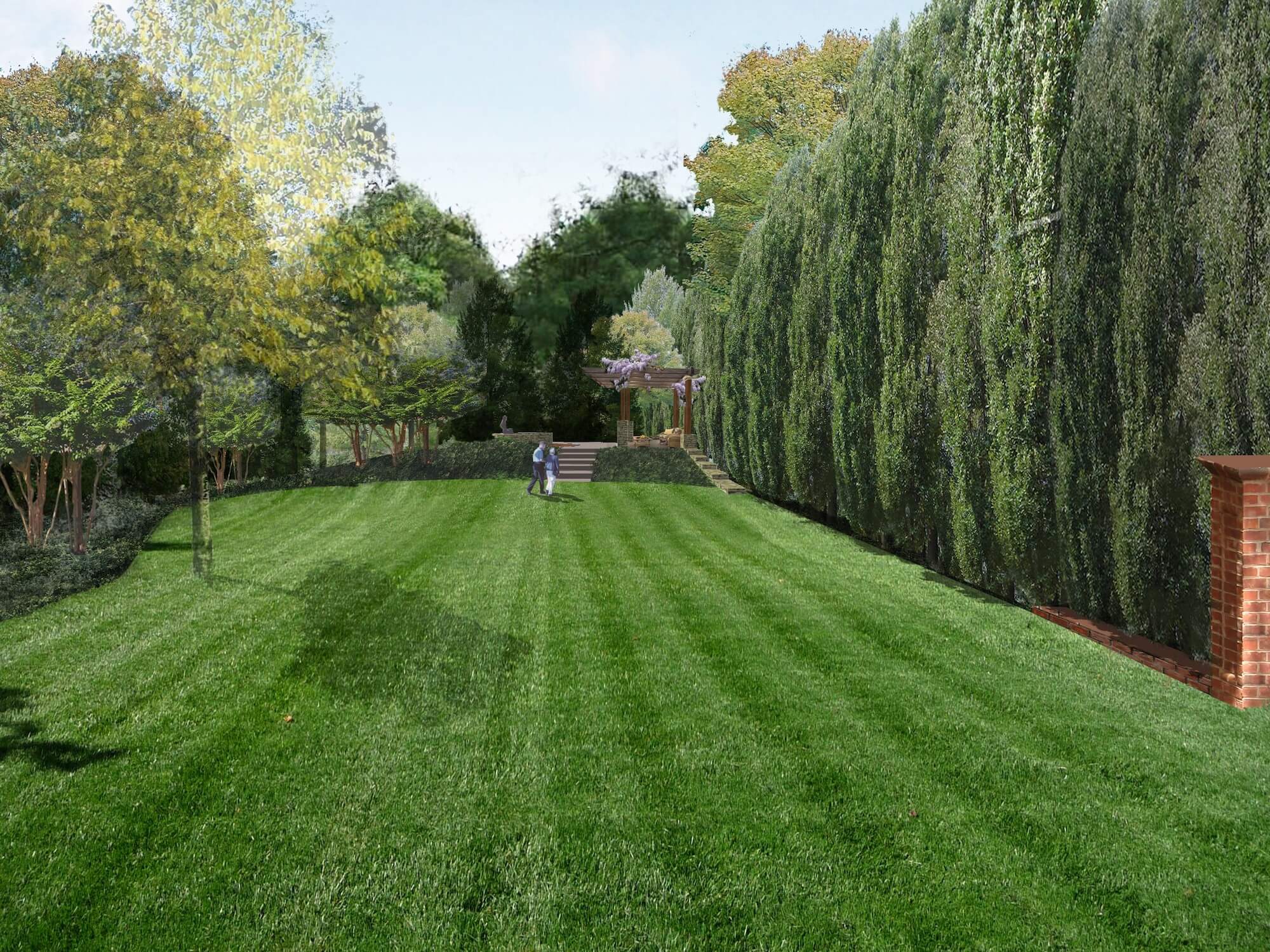 At the core is a central lawn framed by a stately English Oak hedgerow, offering privacy and spatial clarity. A fluid sequence of outdoor rooms including a pool terrace, dining pergola, woodland grotto, and hidden garde —unfolds across the site, linked by stone paths and unified by a native planting palette. Mature preserved Oaks and Maples were integrated as natural landmarks, while new woodland borders restore ecological continuity with increased privacy.