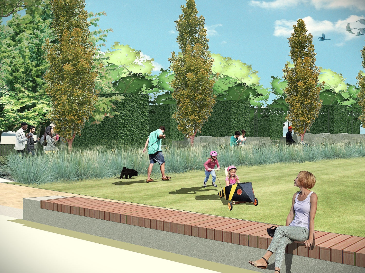 Inspired by the neighboring East River vegetative ecology, repetitive compositions of meandering groupings of shade and flowering trees with their companion underplantings establish a visually calming and spatially unifying landscape character. The scale and density of this common vegetative language boldly registers against the backdrop of its neighboring towers. The planted contoured landforms, coupled with distinct level changes, diversify the park’s landscape experiences of movement and pause. Custom-designed seating elements and plantings edge an open central lawn terrace, designed to orient residents, and imply a symbolic and communal center. Its multi-purpose versatility functions like a galvanizing "village green" with its open quality that contrasts with the rooftop's woodland forest perimeter. Elevated only two levels above street level, the landscape’s spatial structure masks the roof's boundaries and softens the towering neighboring buildings’ presence offering residents a complete immersive natural world escape.