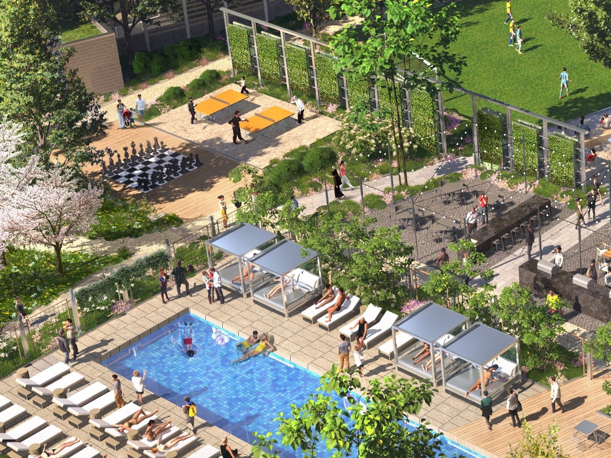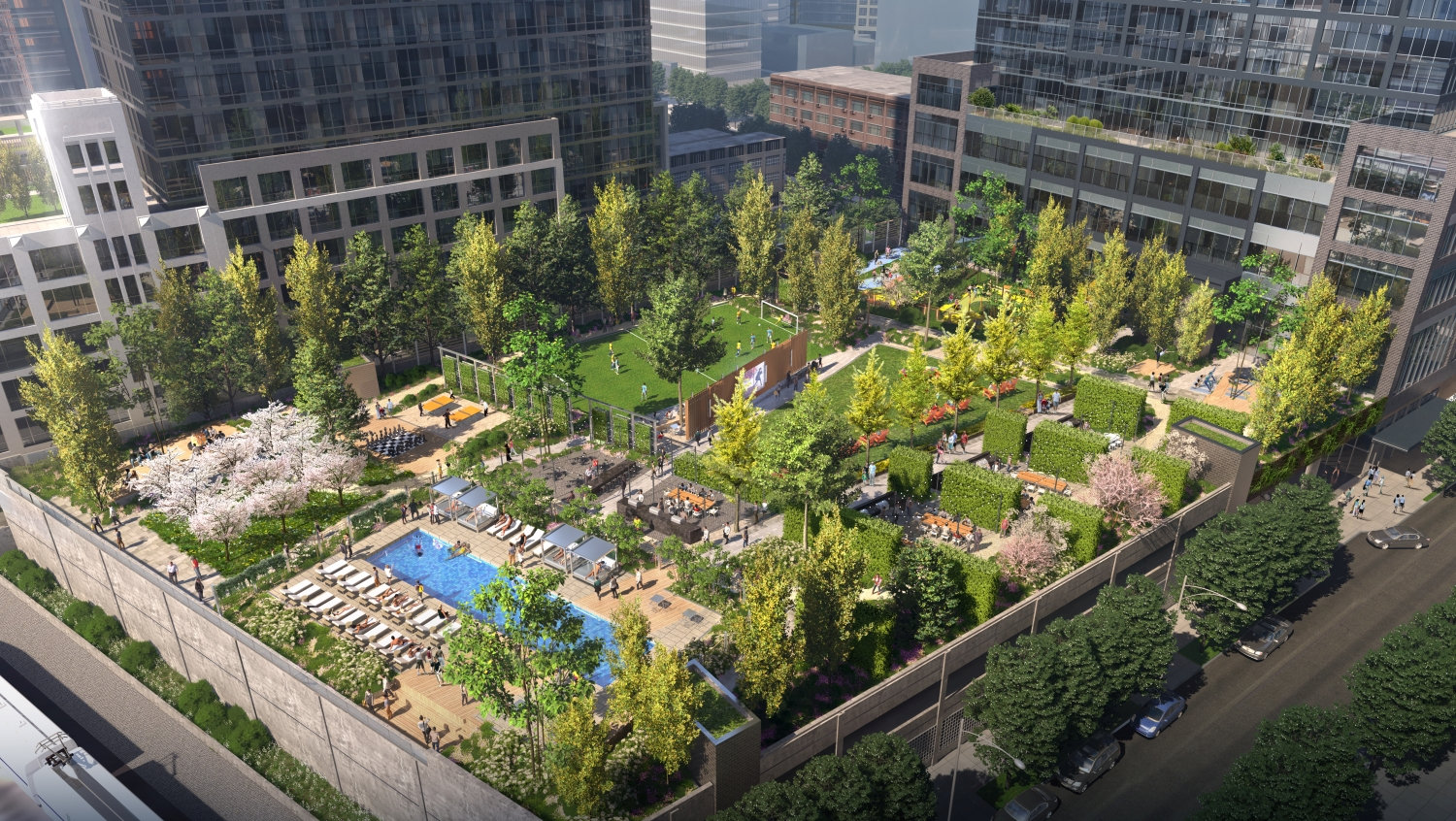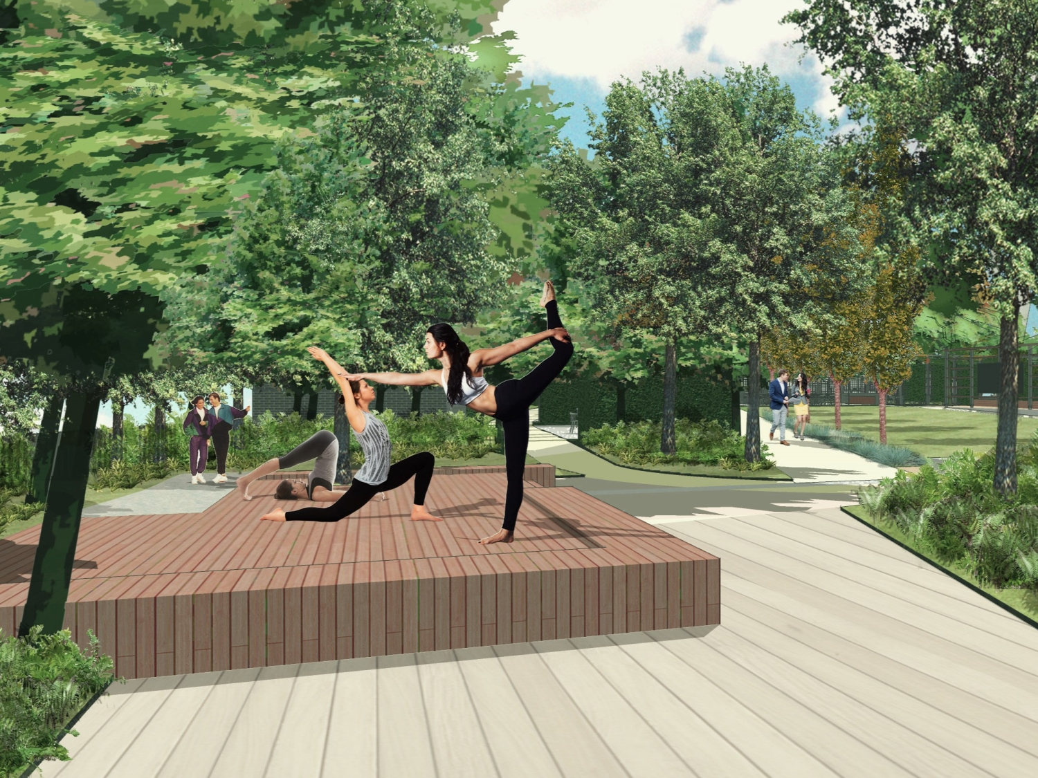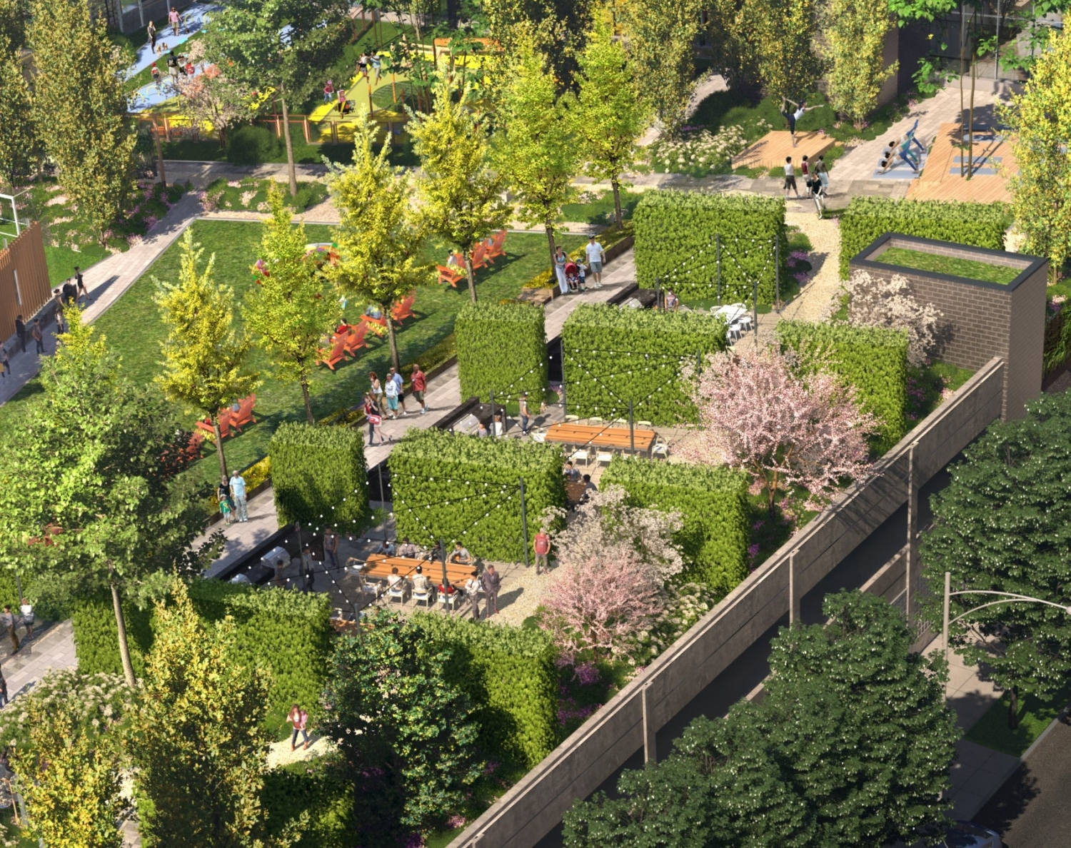 Located on Orchard Street, The Orchard stands as Long Island City's tallest residential tower. It is named after its street address and 1.38-acre rooftop park landscape, which features an apple tree orchard as its signature planting feature. The park's landscape is designed as an open space resource with community-building activity offerings. Located more than a ten-minute walk from the nearest public open space, residents have immediate visual and physical access to an amenity-rich and verdant landscape oasis to soothe city life stresses. The Orchard's community park offers various outdoor passive and active recreation activities unparalleled in New York City's residential market. Each activity area is spatially organized and visually bonded by an all-encompassing woodland forest landscape design.