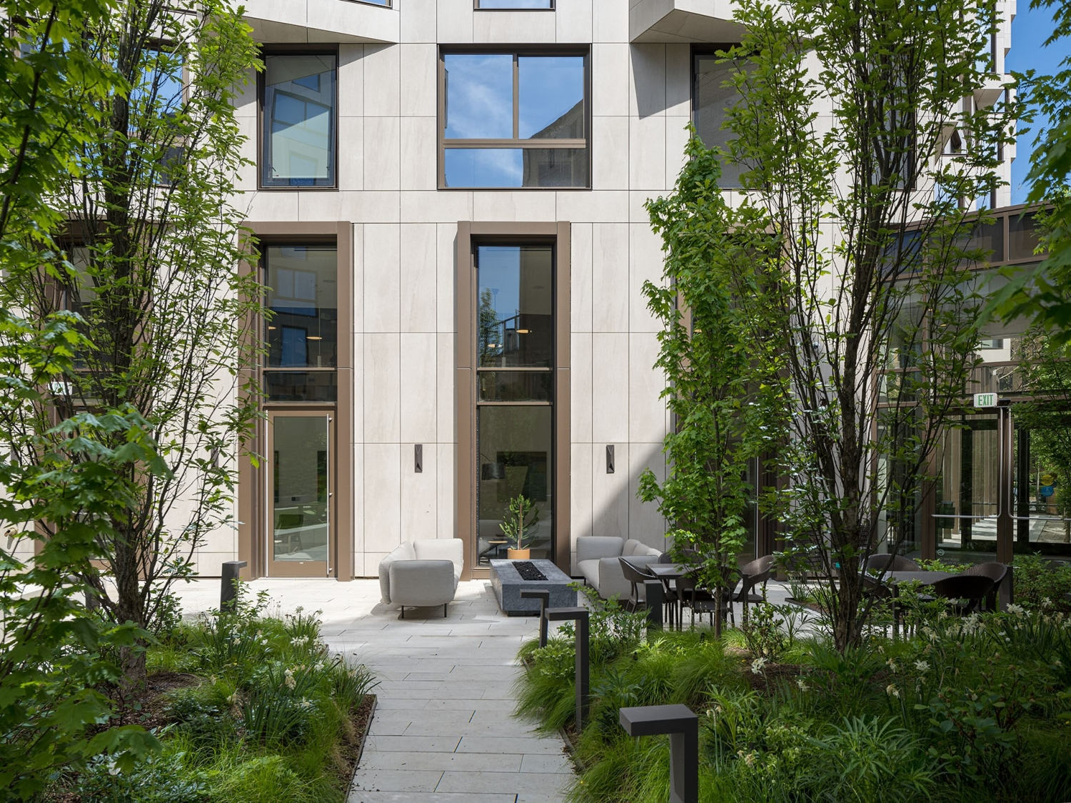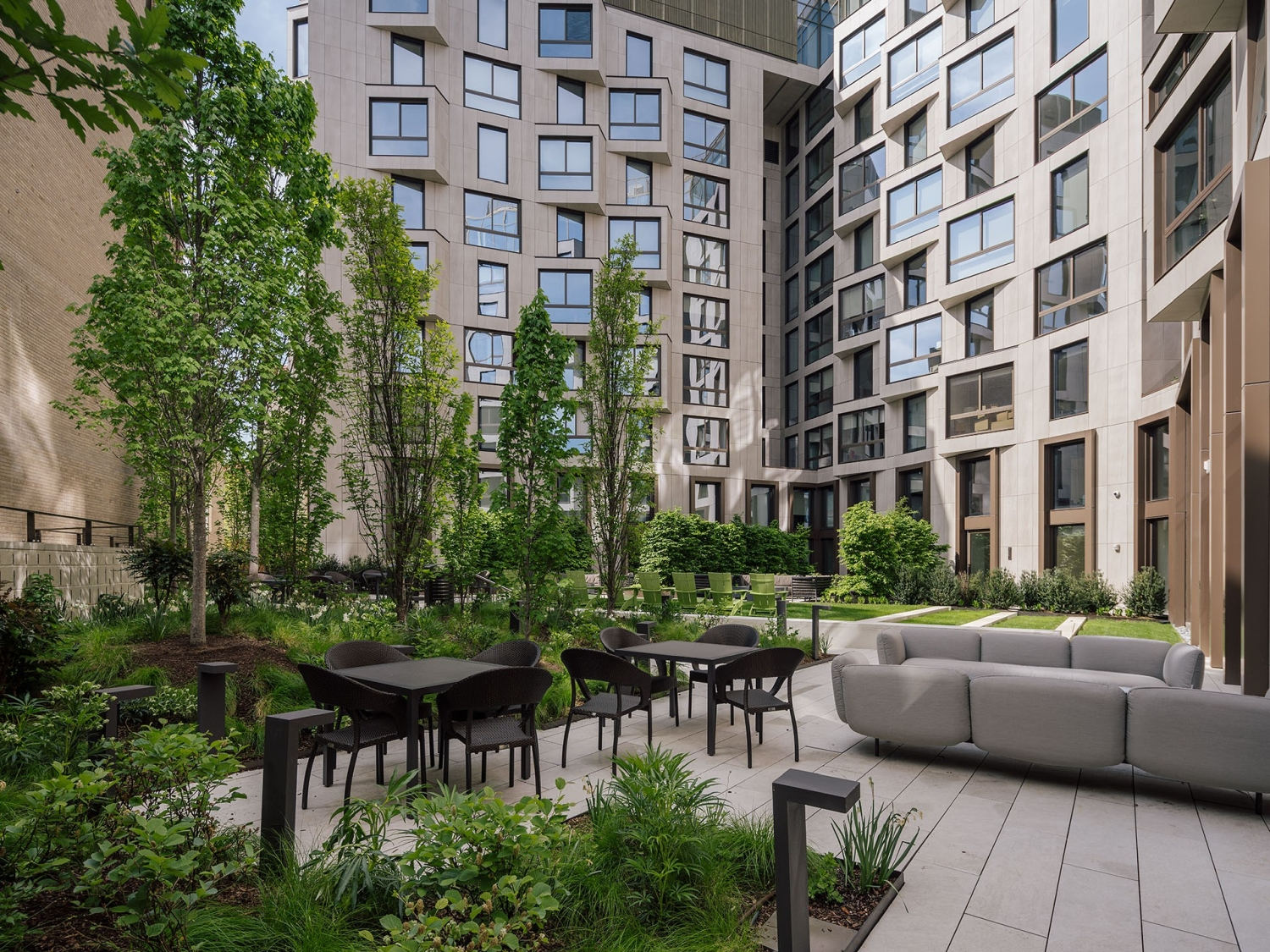 Located within Washington, DC’s embassy district, The Silva is a transitional in-fill residential development sensitively knitted within a historic institutional district and a vibrant residential neighborhood. Resting on a corner with two street frontages, its human-scale and residential qualities are presented by the bond of the building and its public streetscape landscape. Historic religious and embassy structures abutt the development parcel’s interior perimeter on which the building’s horseshoe footprint faces, creating a central garden courtyard. Designed as a communal community building resource, the courtyard landscape is a distinct “secret garden” for peaceful occupation and visual wonder. Accessible from three sides, its permeability enhances flow and psychological connections to the neighborhood. The courtyard’s woodland characteristics draw reference to nearby Rock Creek Park Forest native plant communities. The garden’s forest perimeter spatially defines a medley of communal and social gathering garden rooms. As a vegetative backdrop, its copses of tall Maple and Oak trees provide privacy and soften the neighboring buildings’ irregular presence. The expansive continuity of the courtyard’s native plant communities spatially binds its activity spaces to create a visually calming, cohesive landscape character. With its multi-purpose function as a residential community space, the courtyard’s central location provides residents with a dynamic seasonal sanctuary for peaceful escape or simply a place to view and commune with its natural world wonders.